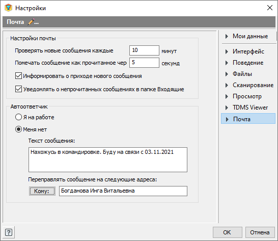 В тех случаях, когда вы продолжительное время отсутствуете на рабочем месте, или не имеете возможности работать с TDMS, рекомендуется использовать переадресацию входящих сообщений. Настройка перересации производится на вкладке Автоответчик диалога свойств пользователя.