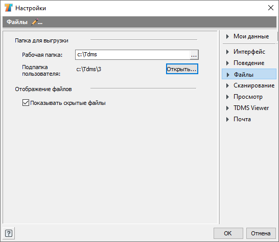 Пользователь TDMS может самостоятельно настроить папку для выгрузки файлов объектов.