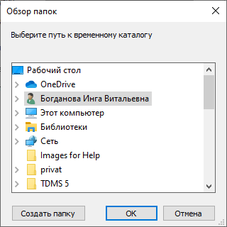 - Чтобы изменить значение пути, по которому будут выгружены файлы, введите новый путь в поле Локальная временная папка или откройте системный диалог выбора папки, щелкнув на кнопку с тремя точками, расположенную в конце поля ввода.